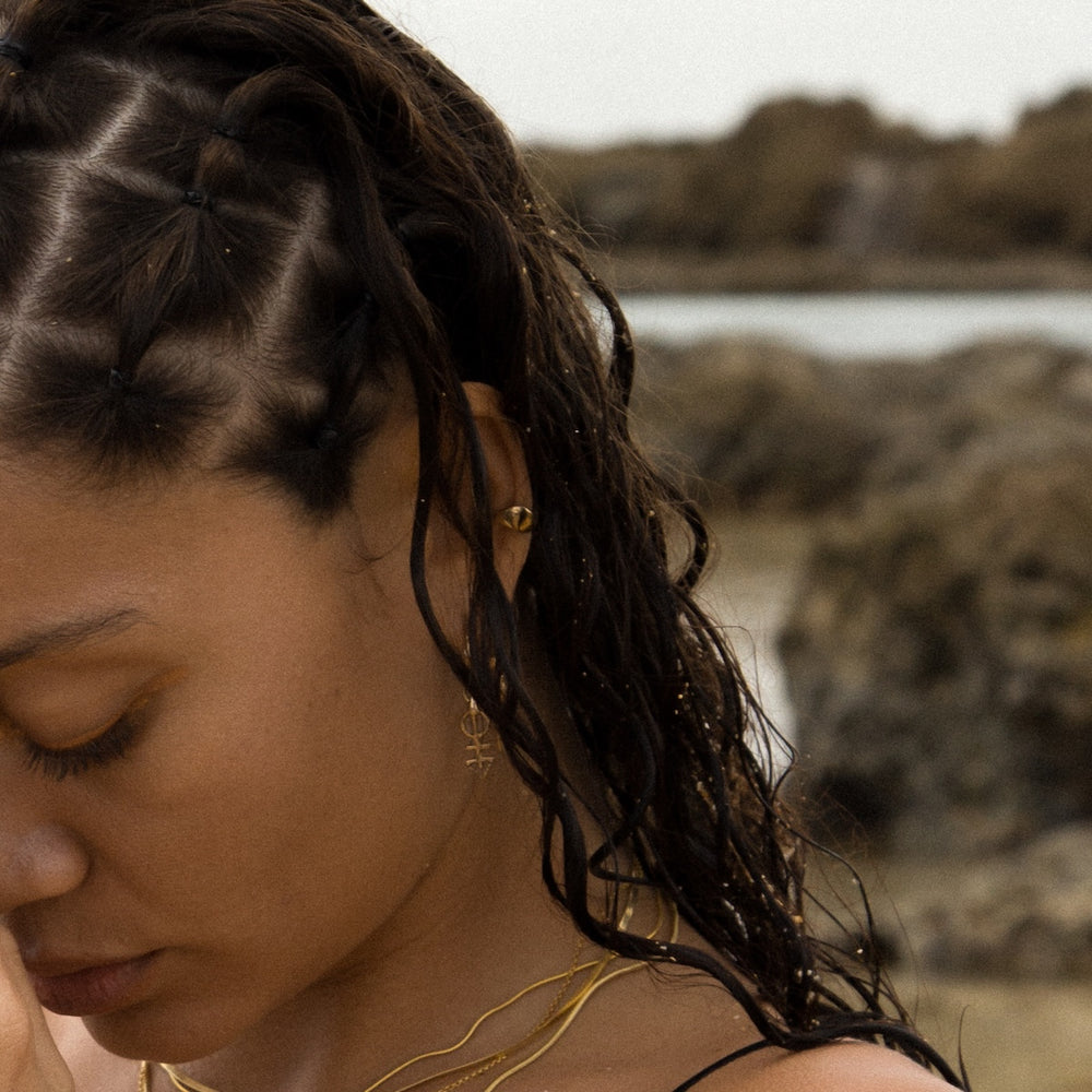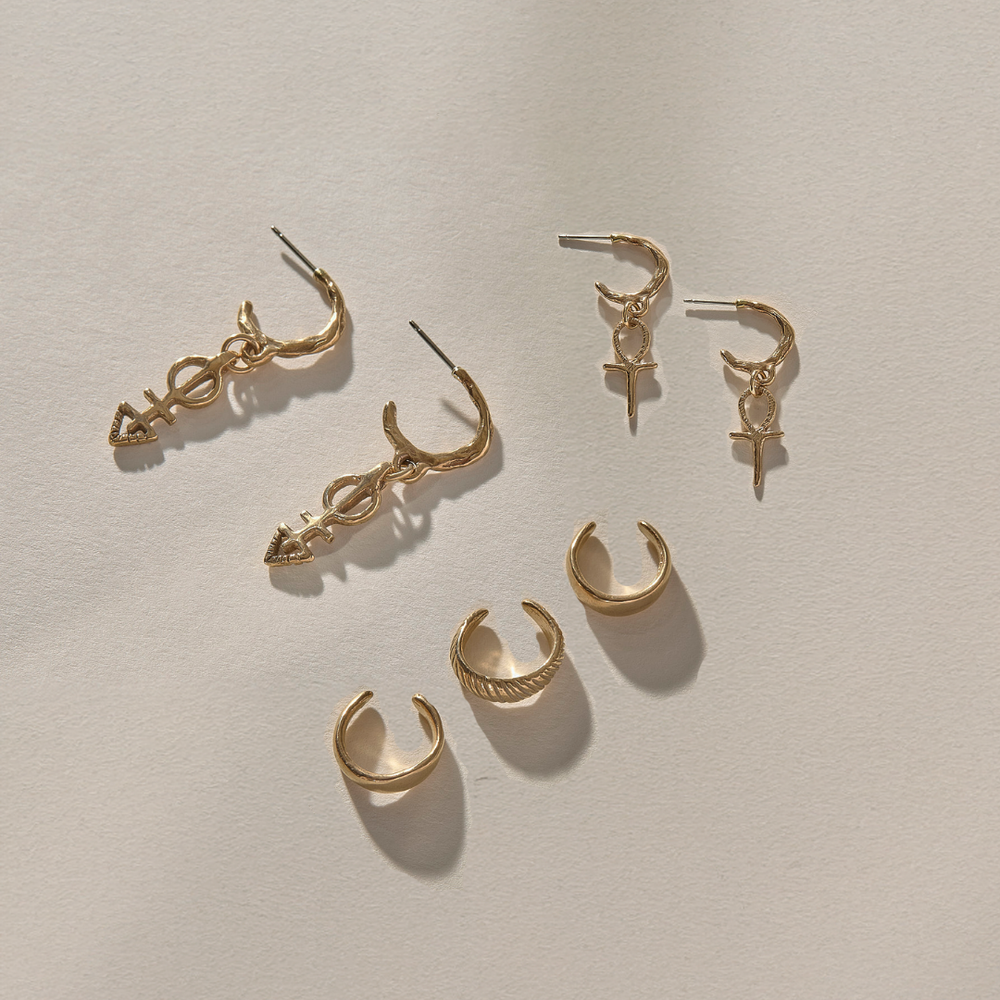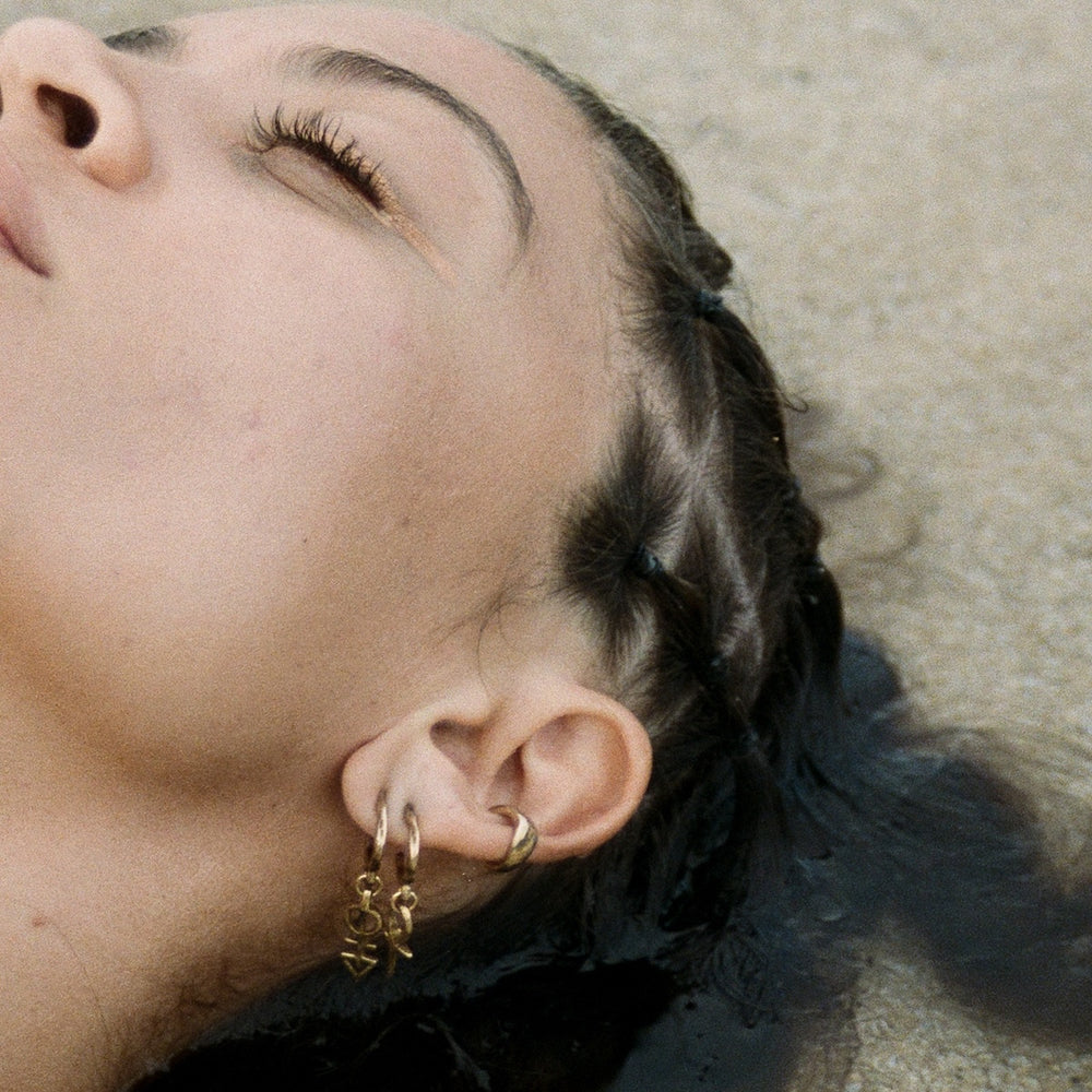 The Mystic Summer Hoop Set is a magical trio of adornments to stack for summer - featuring the Ma’at Hoops, Ankh Charm Hoops, and Anut Cuff Set.